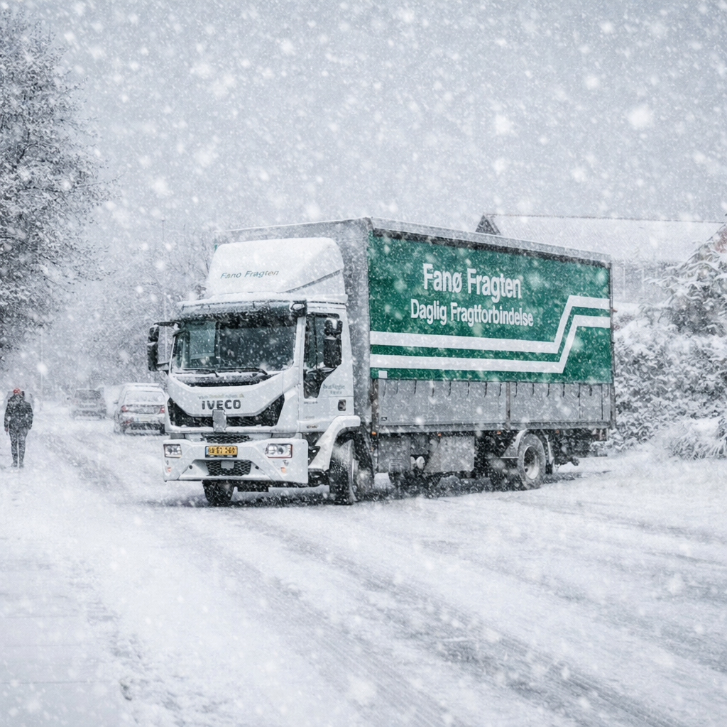 Men sne, slud og vestenvind ændrer ikke på vores ansvar. Vi forsøger altid med stabil og pålidelig transport mellem Esbjerg og Fanø hver dag, så både virksomheder og private får deres varer frem til tiden.